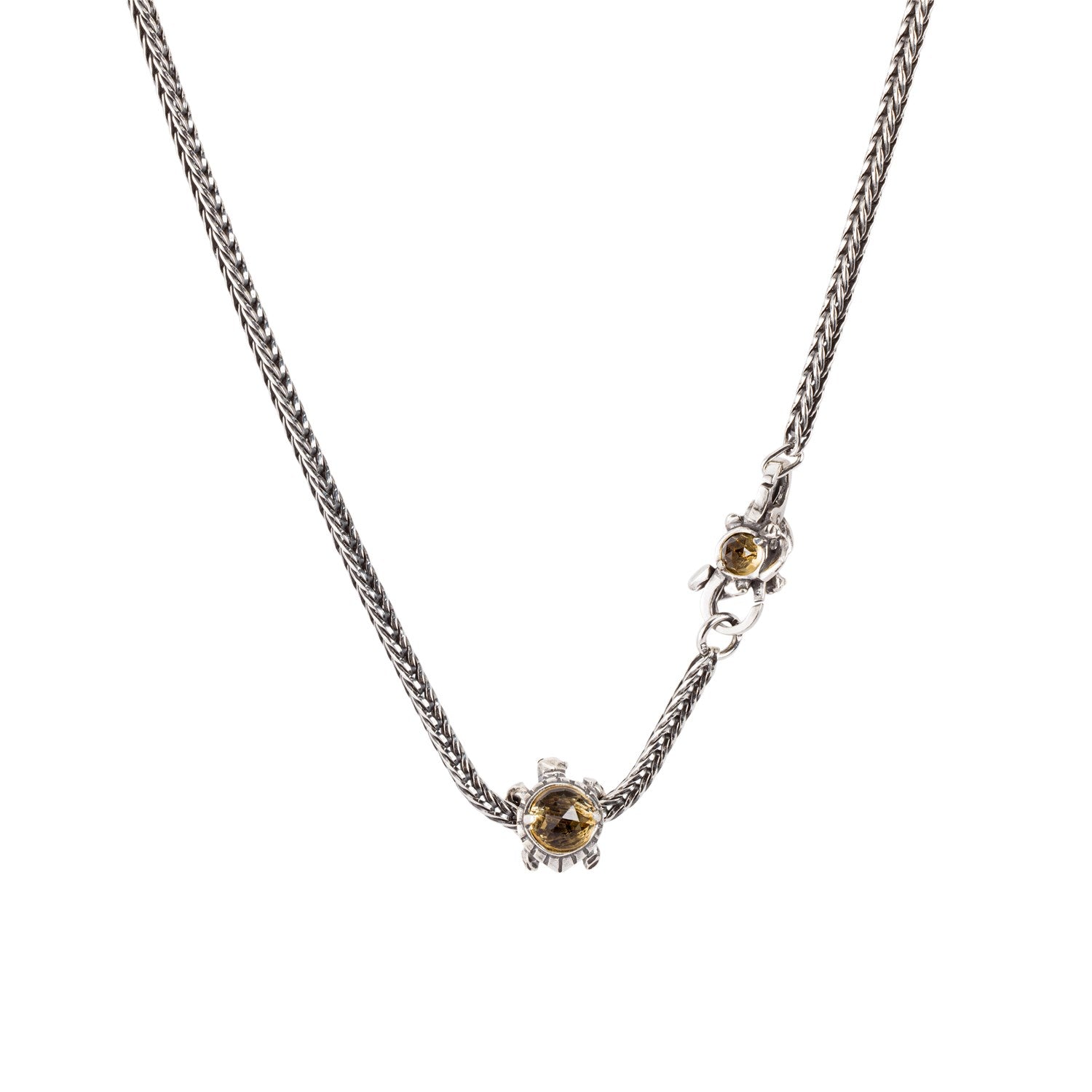 A silver clasp with a beautiful facetted Citrine Quartz on one side and a Cognac Quartz on the other.
