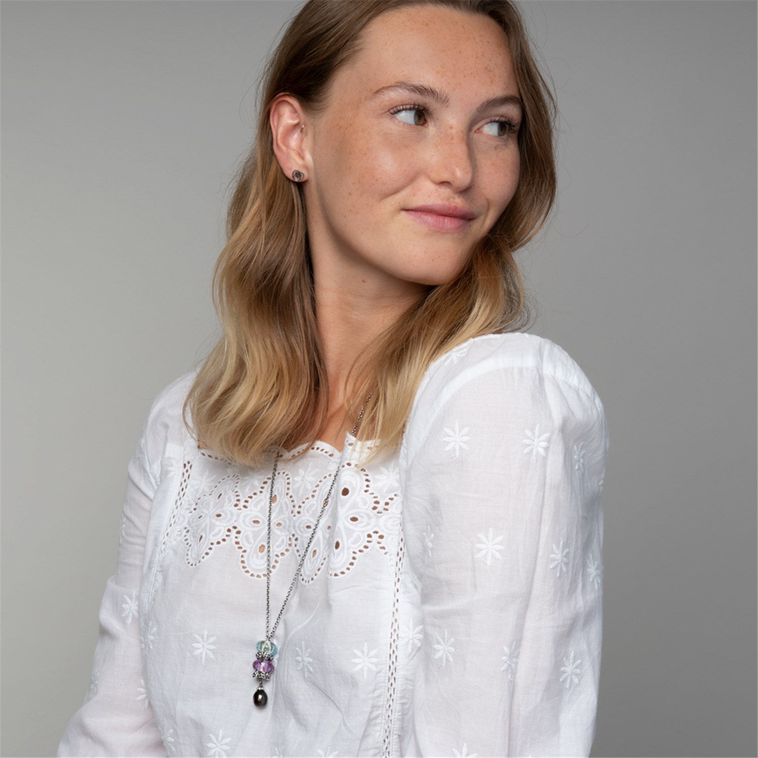 Model with Fantasy necklace in seven differen sizes
