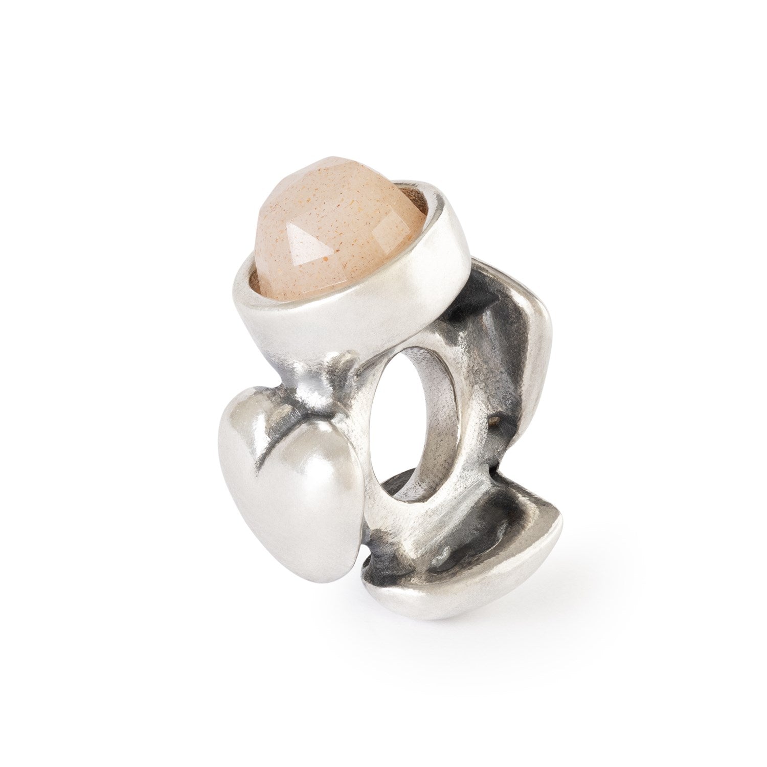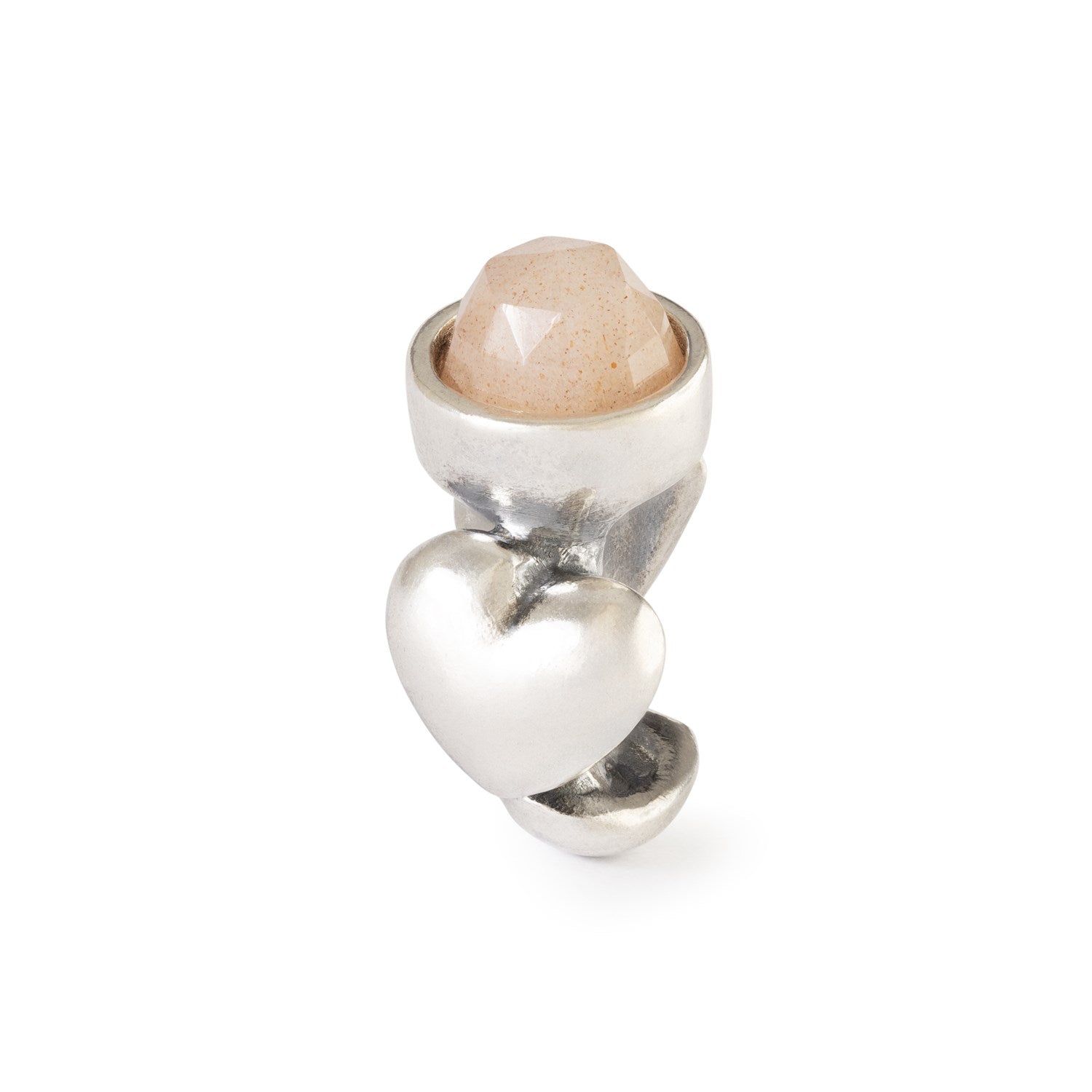 Three hearts embrace a faceted Feldspar Moonstone that shimmers with soft, warm tones. The design symbolizes care, affection and the gentle strength of love.
