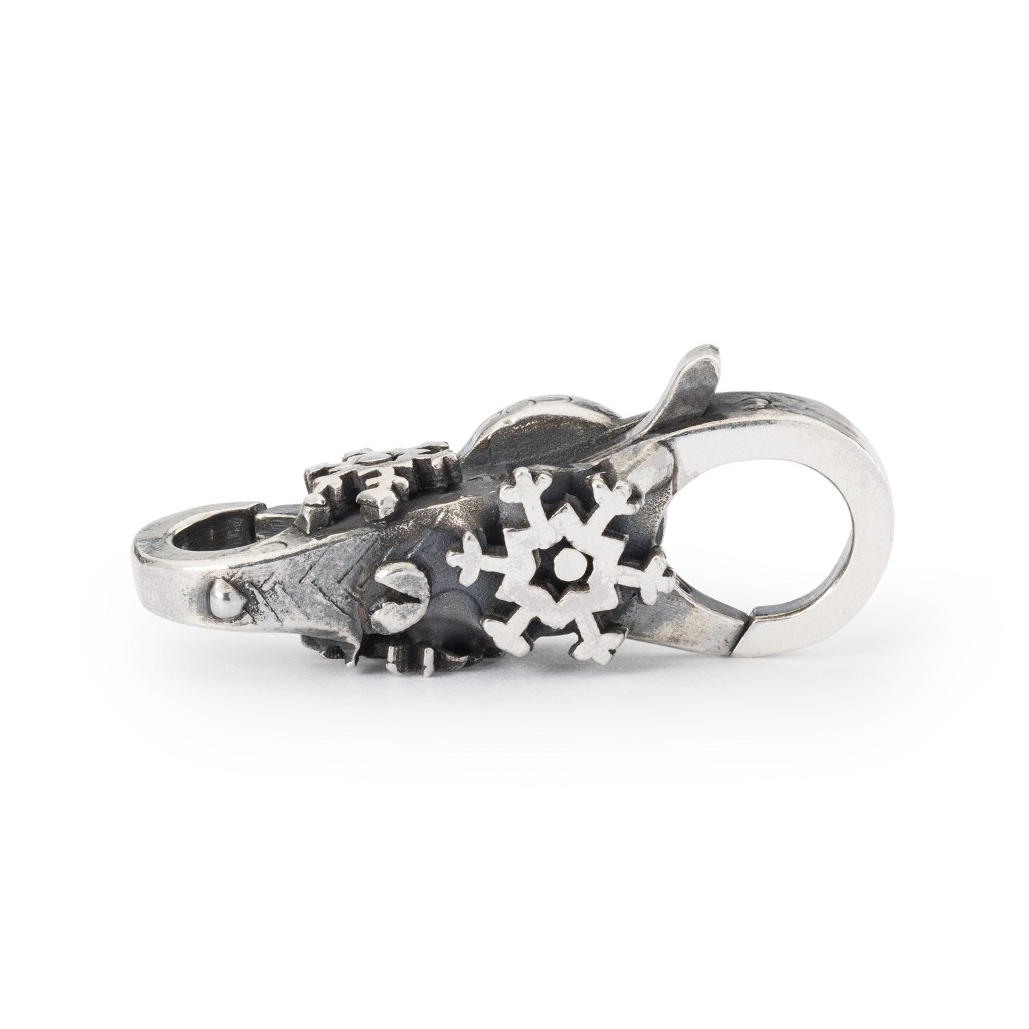 A snow white Mother of Pearl is inserted into this clasp, where it plays beautifully with the detailed snowflakes on the other side.